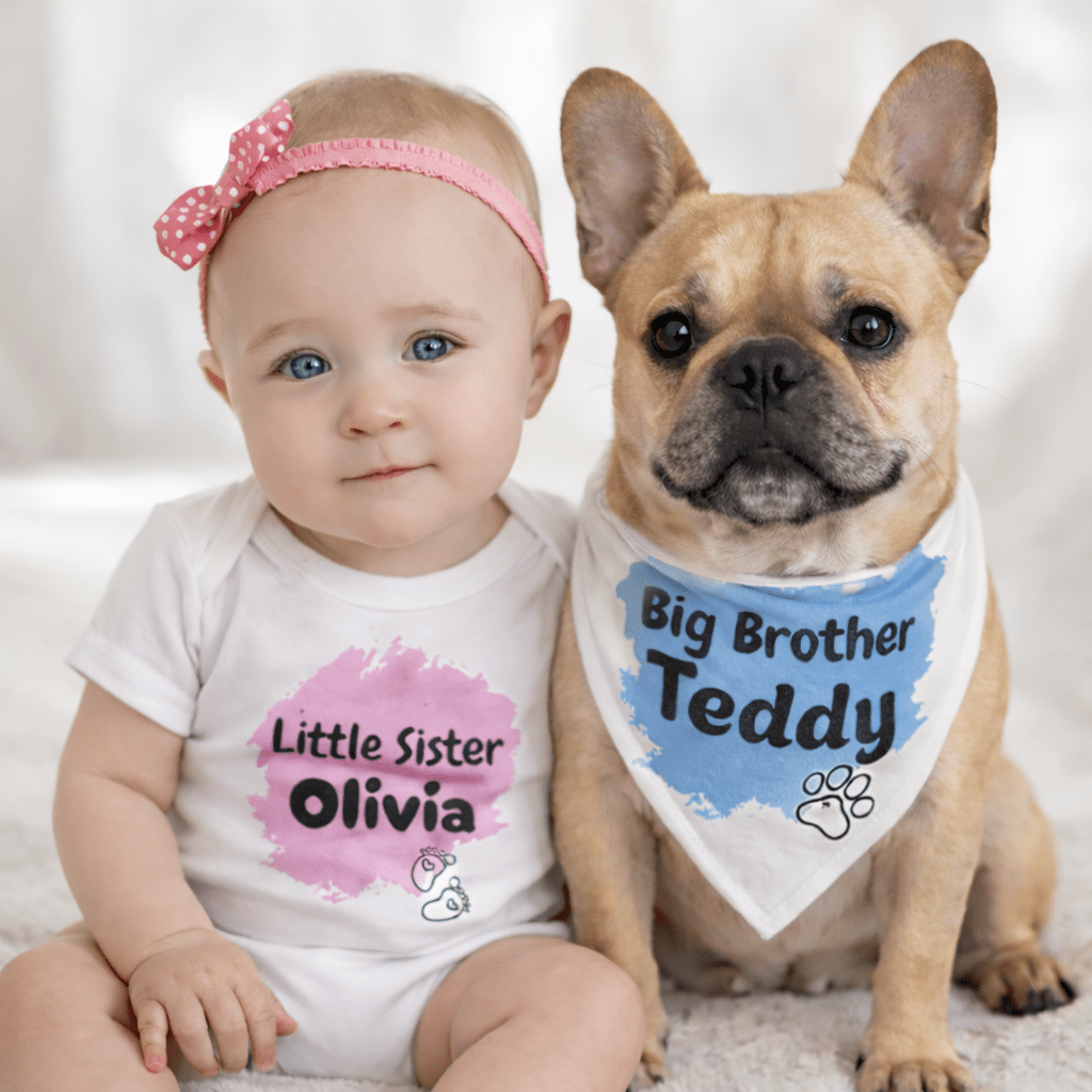 Okay, this one is for a very specific but very sweet situation that is actually more common than you would think. If someone in your life is welcoming both a new puppy and a new baby around the same time, or if they are expecting and already have a dog at home, this matching set I found on Etsy made me genuinely say “aww” out loud alone in my kitchen. It is a Big Brother dog bandana and Little Sister baby onesie set that you can personalize with names, and it is exactly the kind of thing that will make a new mama cry happy tears and then immediately take three hundred photos. It celebrates both the dog and the baby as equally important family members, which is correct.